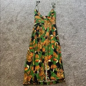 Bold tropical-print maxi with adjustable tie straps. Flowing silhouette with button-front detail. Lightweight fabric for warm days and travel.