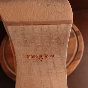 Chunky platform mule with smooth leather upper. Slip-on style with high block heel. Textured wood-look platform sole. Modern retro silhouette for everyday wear.