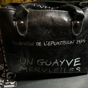 Sleek black vinyl tote with white printed script. Dual top handles and zippered main opening. Simple, modern graphic look. Great everyday carry option.