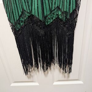 Sleeveless costume cocktail dress with intricate black beaded embellishment and fringe hem. Great for Gatsby theme event. Feminine V-neck silhouette that flatters the figure. Features striking black beadwork on a rich green base. Great pre-used condition with some fraying on the tassels.