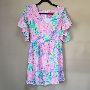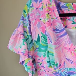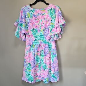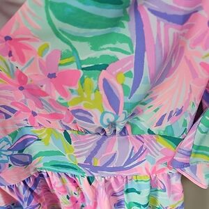 Bright pink fabric label with gold embroidered Lilly Pulitzer logo. Tag shows size and gold text. Vibrant pink and metallic gold accents.