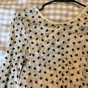 Elegant cream lace dress with all-over small black motif. Lightweight, long sleeves offer a refined silhouette. Soft fabric and subtle drape for effortless wear. Perfect for day-to-night occasions in cream and black.