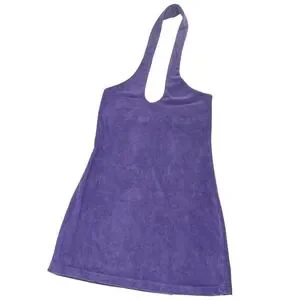 Soft terry cloth halter dress in a vibrant purple hue offers a comfortable, relaxed fit perfect for poolside lounging or casual summer outings. Crafted from a cotton-blend fabric with a plush texture, it features a deep scoop neckline and a classic halter strap. The A-line silhouette provides a breezy feel, while the recycled polyester blend adds a sustainable touch to this versatile beach-ready piece.