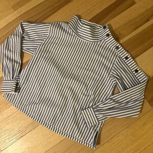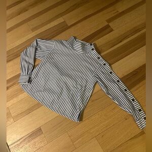 It’s all in the details! This chambray blue and white striped mock neck blouse has one side joined completely by buttons from cuff of the sleeve to the neck. Sized an XS, it fits me as a medium well.