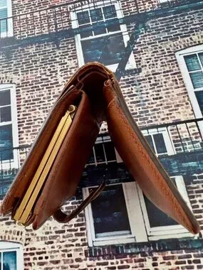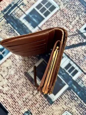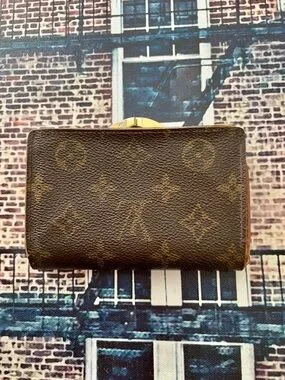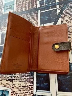 Classic Louis Vuitton monogram bifold wallet. Coated canvas with iconic LV pattern. Snap closure with gold-tone button. Timeless brown colorway. Versatile everyday accessory.