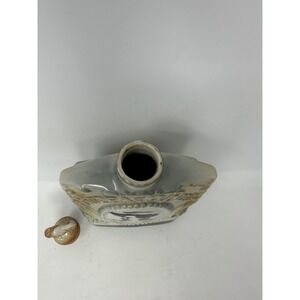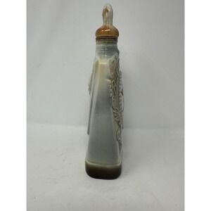 Vintage ceramic whiskey decanter honoring W.F. Buffalo Bill Cody (1846-1917), the legendary showman of the Wild West. This commemorative piece features a detailed portrait of Buffalo Bill on the front and a vibrant illustration of his "Wild West" show on the reverse, complete with stagecoaches and rough riders. The decanter is finished in a multi-tone glaze of cream, grey, and brown, topped with a unique buffalo-shaped stopper. The base is inscribed with "Leavenworth, Kans Boyhood Home of Buffalo Bill," making it a perfect collectible for history buffs or Western decor enthusiasts.