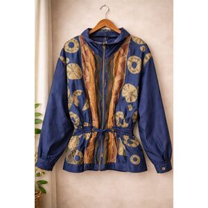 Striking vintage silk windbreaker jacket featuring bold abstract patterns in rich blue, gold, and earthy tones. This lightweight piece has a relaxed fit with a functional front zipper and adjustable cinch waist for a flattering silhouette. The 100% silk construction gives it a soft drape with a subtle sheen, making it both comfortable and eye-catching.