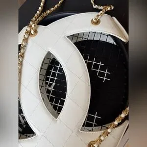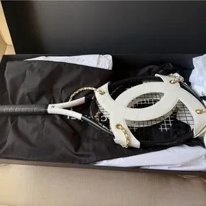 The tennis racket is colored black and white with the Chanel logo on the frame and on the handle. The racket strings have the CC logo on it.