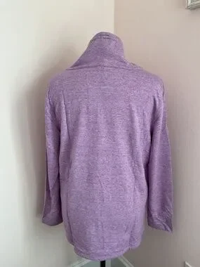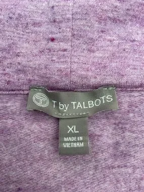 Talbots "T by Talbots" misses XL longsleeve sweatshirt in a heathered purple color. Cowl neck with drawstring and cozy fleece lining. Easy care fabric is 86% rayon, 9% polyester and 5% spandex. Machine washable. From a pet and smoke free home. Pit to pit measurement is 22.5 inches.