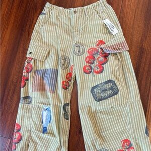 BDG kids cargo pants in beige with subtle cream stripes. Playful red tomato cluster and blue fish and stamp prints. Cargo pockets and belt loops for practical wear. Lightweight fabric for everyday comfort.
