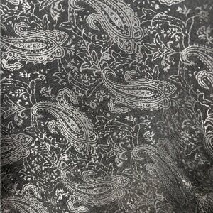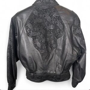 🖤 Vintage gem alert! This Wilsons The Leather Experts cropped jacket is everything — genuine black leather with intricate silver paisley embossed panels throughout. The back yoke, collar, cuffs, and hem band all feature that gorgeous tonal paisley detail that makes this piece truly one-of-a-kind.