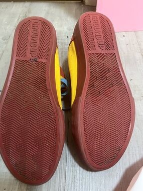 Vibrant yellow canvas high-top sneakers with red toe and sole accents and light blue laces. Cushioned insole and flexible rubber outsole for comfortable everyday wear. Eye-catching color-block design that pairs well with casual looks.