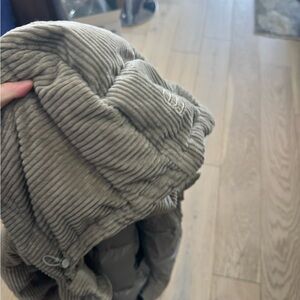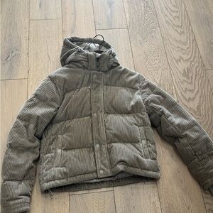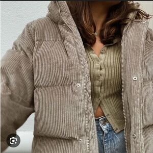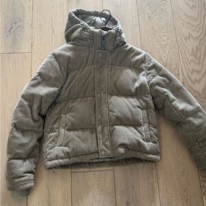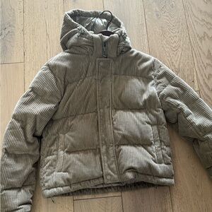 Warm corduroy puffer jacket with hood. Soft textured corduroy exterior. Front zip and snap closures. Boxy, casual silhouette. Neutral taupe color pairs easily with outfits.