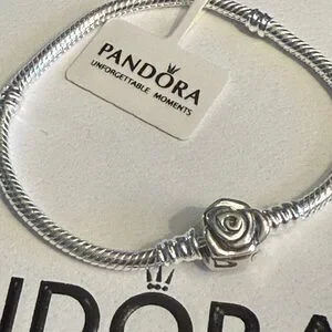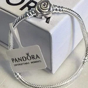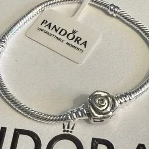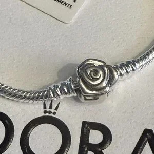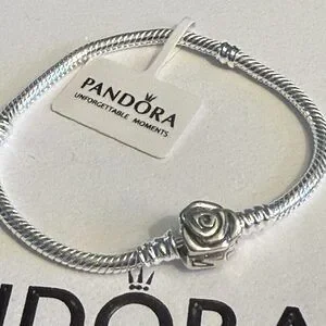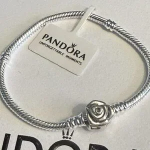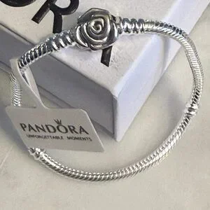 This authentic Pandora bracelet features a refined 22cm chain crafted in sterling silver with a signature rose clasp closure. Designed for the discerning collector, this piece combines Pandora's renowned craftsmanship with timeless elegance. The secure clasp mechanism ensures reliable wear, while the versatile size accommodates most wrists comfortably. Perfect as a foundation for charm customization or worn solo as a sophisticated statement piece. An investment in quality jewelry that transcends seasonal trends.
