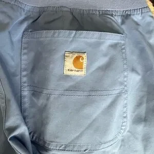 Carhartt Periwinkle jogger pants with cargo pocket at the thigh. Elastic waistband with drawstring for an adjustable fit. Ribbed ankle cuffs for a tapered look. Comfortable stretch fabric for daily wear.