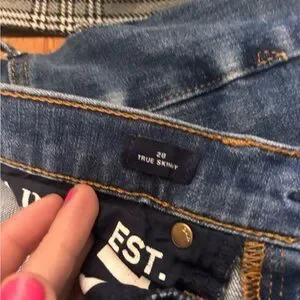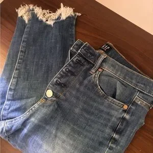 High-rise denim with button-fly closure. Dark blue wash with subtle distressing. Classic five-pocket styling and contrast stitching. Timeless casual look that pairs easily with tees or blouses.