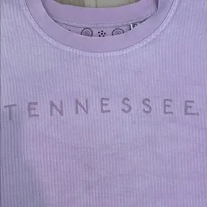 Soft lavender ribbed short sleeve sweatshirt with "TENNESSEE" across the chest. Relaxed cropped fit. Subtle logo patch at hem. Lightweight and cozy.