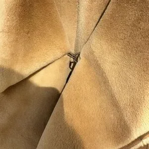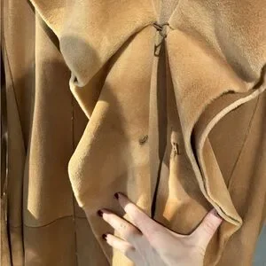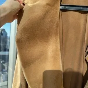 Soft suede trench with cascading ruffle trim. Long sleeves with subtle bell cuffs. Open front with elegant drape. Sophisticated camel tone for versatile styling.