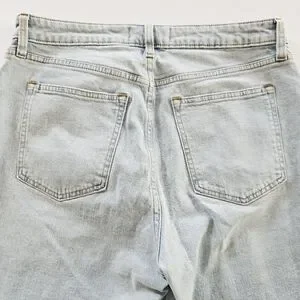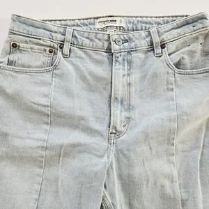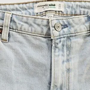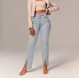 On-trend 90's-style ultra high rise straight jeans in A&F's signature Curve Love fit with built-in stretch for superior comfort featuring the highest rise that sits at your natural waist and looks great with your shirt tucked or untucked. Curve Love features an additional 2" through the hip and thigh to help eliminate waist-gap. With refined details and a vintage feel from top to bottom, this style features a full length leg, light indigo wash, seaming details down the leg and trendy front split-hem vent detail. These are in excellent pre-owned condition.
