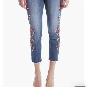 Reese Embroidered straight leg raw hem cropped wash jeans