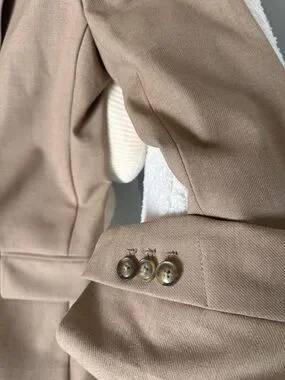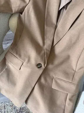 Structured blazer with notch lapels and a single-button closure. Flap pockets and buttoned cuffs for a polished finish. Neutral camel tone pairs well with work or casual outfits. Measurements: