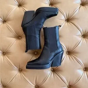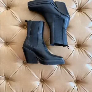 Sleek black leather Chelsea boots with elastic side panels. Chunky stacked block heel and platform sole. Pull tabs at heel for easy wear. Modern silhouette pairs with dresses or denim.