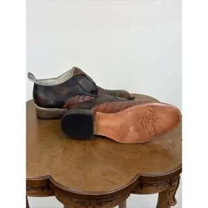 Description: Mixed material, burnished leather, alligator, single lace. pull tabs, stacked heel shoe. Leather.