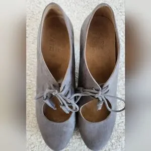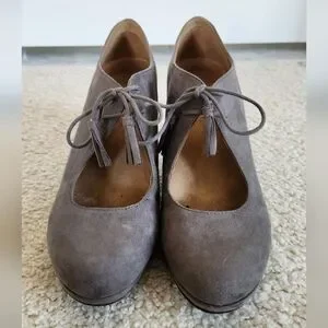 Elegant taupe suede lace-up pumps with tassel detail. Soft suede upper provides a refined look. Comfortable block heel for all-day wear. Versatile taupe color pairs well with many outfits.