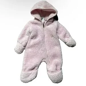 Cozy pink hooded one-piece crafted from plush sherpa fabric. Designed for warmth and easy dressing with a front zipper. Gentle pink color keeps your child looking sweet and comfortable.