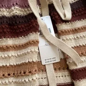 This piece is brand new with tags ($120 CAD retail) and features a beautiful textured stripe pattern in warm neutral tones. The wrap-style design with adjustable tie waist creates a flattering, effortless silhouette.