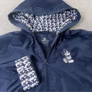 Walt Disney World Windbreaker Jacket Womens Large Blue Mickey Hooded Full Zip
