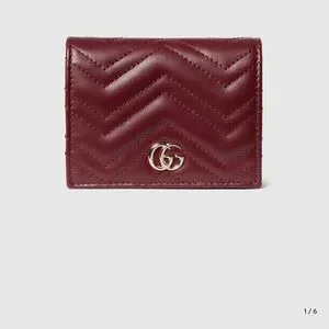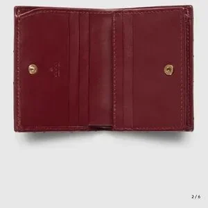 Gucci mini wallet in chevron quilted leather. Rich deep maroon color with gold GG logo. Compact and elegant design. Sleek flap closure and smooth stitching.