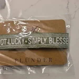 Plunder set with gold-tone charm necklace. Stretchy bracelet of blue beads with orange and pink accents. Includes additional gold-tone charm and ribbon wrap. Playful, colorful styling.
