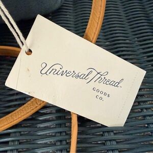 Universal Thread crossbody in woven straw with a mustard leather-look flap and matching strap. Hands-free design for casual wear. Simple stitched detail on the flap adds charm.