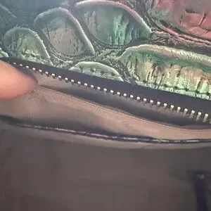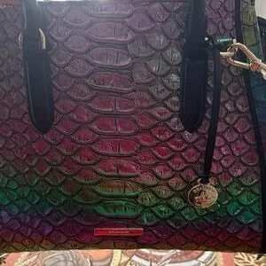 Multicolor croc-embossed satchel with structured top handles and detachable shoulder strap. Shimmering green, purple and pink tones create a standout iridescent finish. Sleek gold-tone hardware adds polished detail for day-to-night wear. Practical interior pockets keep essentials organized in style.BRAND NEW! Never used! A real show stopper! Beautiful tones of purple, metallic green, blue, rainbow metallic in fish tail like design. Sure to bring tons of compliments! Dust bag included, strap included.