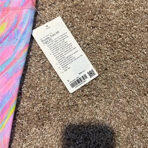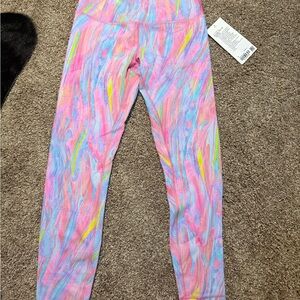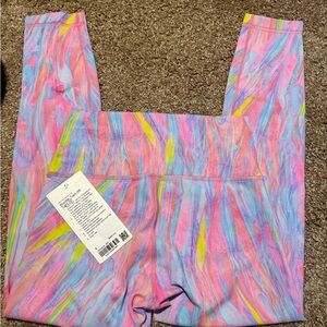 Bright marble-print leggings with a smooth stretchy fabric. High-rise waistband offers a secure fit. Colorful swirls in pink, blue and yellow for a playful look. Lightweight performance material for workouts or everyday wear. Size 8