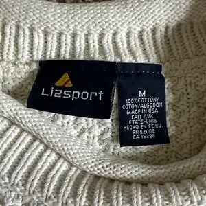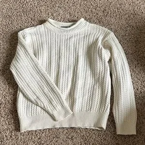Soft cream crewneck sweater with a textured cable-knit pattern. Lightweight and comfortable for everyday wear. Versatile neutral that pairs easily with jeans or skirts. Crew neckline and ribbed cuffs for a polished finish.