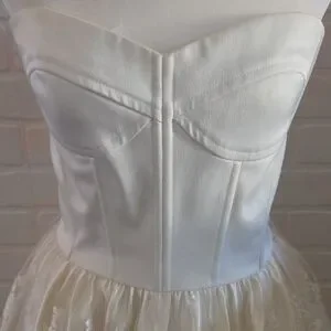 Sweet strapless mini with structured bodice. Full lace skirt with floral embroidery. Feminine and flirty silhouette. Easy to style for parties and proms.