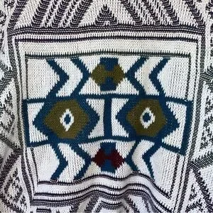 Cozy white knit sweater featuring bold geometric black patterns and a central teal and olive motif. Soft, warm fabric with a relaxed fit for easy layering. Stylish statement piece that pairs well with jeans or skirts.
