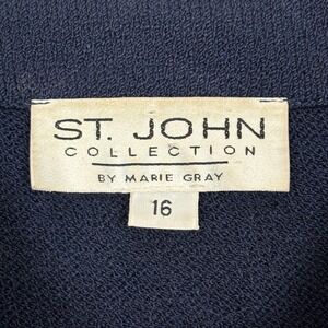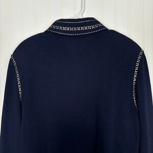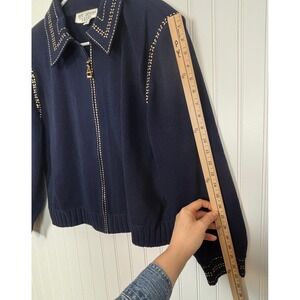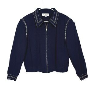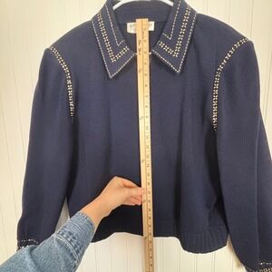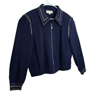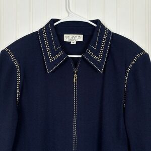Vintage St. John Collection Knit Jacket Women 16 Navy Blue Gold Studded Zip Up