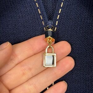 This vintage St. John Collection by Marie Gray knit jacket features a classic navy blue hue accented by elegant gold-tone metallic stud detailing along the collar, shoulders, and cuffs. Crafted in the USA from the brand's signature Santana knit, it offers a structured yet comfortable fit with a full zip front, shoulder pads, and a unique gold-tone padlock zipper pull. The ribbed hem and cuffs add a touch of sporty sophistication to this timeless designer piece. It's a perfect choice for a professional office setting, a sophisticated luncheon, or a polished evening out.