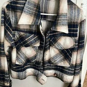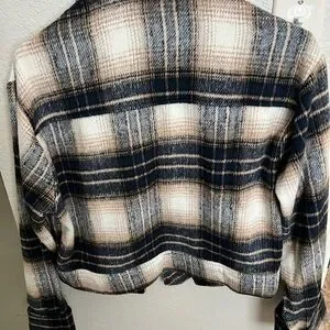 Stylish womens Crop plaid shacket in navy and cream. Lightweight, cozy fabric with a classic collar and front flap pockets. Versatile layering piece for casual outfits. Navy and cream plaid adds timeless style.