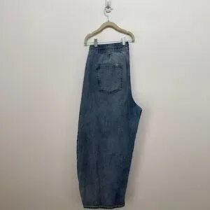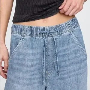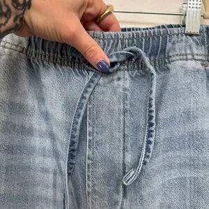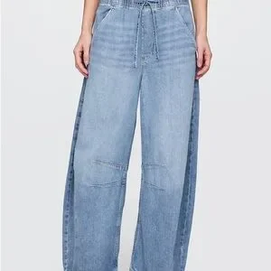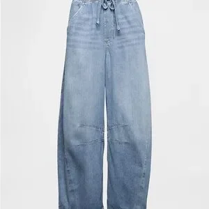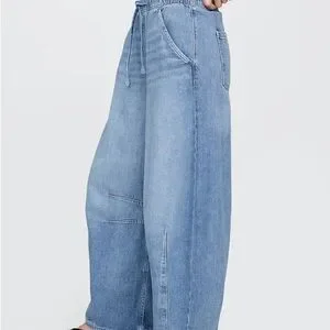 Light blue wide-leg women’s jeans with a relaxed fit and drawstring waist. Comfortable soft denim designed for everyday wear. Casual, versatile style that pairs easily with tanks and tees.