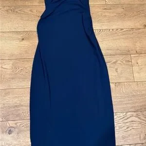 Figure-hugging sleeveless midi dress in deep navy. Open Back design. Versatile piece for day or evening.