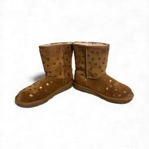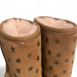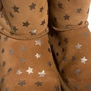 These UGG boots feature the classic chestnut color with an all-over metallic star print. Fully lined with plush genuine sheepskin and crafted with soft suede.