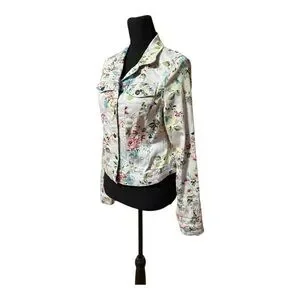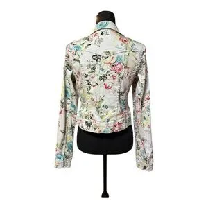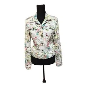 Lightweight fitted jean jacket with all-over floral print. Button-front closure and chest flap pockets. Feminine pastel florals on a white base. Casual and versatile layering piece.