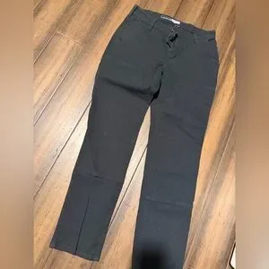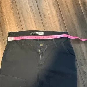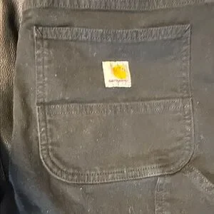 Durable black work jacket. Features a sewn Carhartt logo patch in gold. Clean lines and sturdy stitching. Practical everyday outerwear. Relaxed fit. Size 8.
