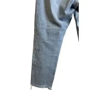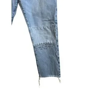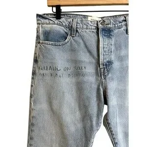 Gently used FRAME Le Slouch “Caspian Graffati” jeans with a relaxed boyfriend fit and scribble print details. Button fly style with a classic blue wash and raw frayed hems. Features faux back pockets (decorative, not functional). Easy everyday denim with a unique statement look.