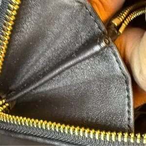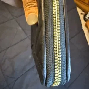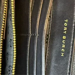 Tory Burch wallet in quilted leather. Top zip closure with logo detail. Slim and structured with diagonal stitch pattern. Classic black leather finish.