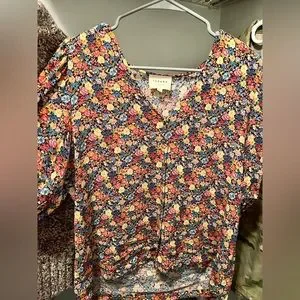Lightweight floral blouse with a flattering V-neck. Flutter short sleeves for a feminine touch. Soft drape and relaxed fit. Easy to pair with high-waist pants or skirts.